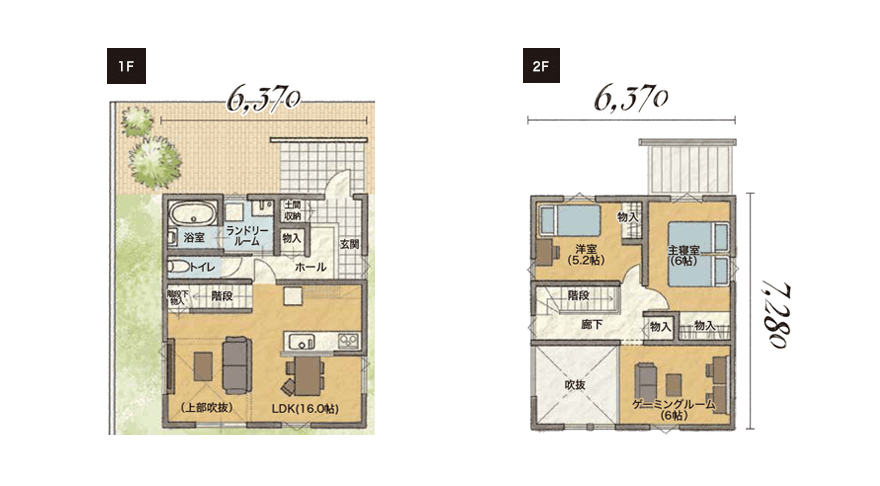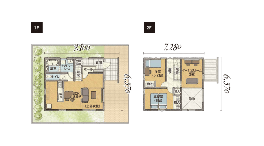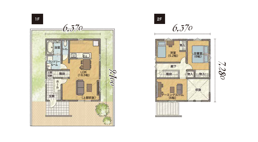 施工床面積97.29㎡(29.42坪)延床面積85.29㎡(25.79坪)1F床面積46.37㎡2F床面積38.82㎡